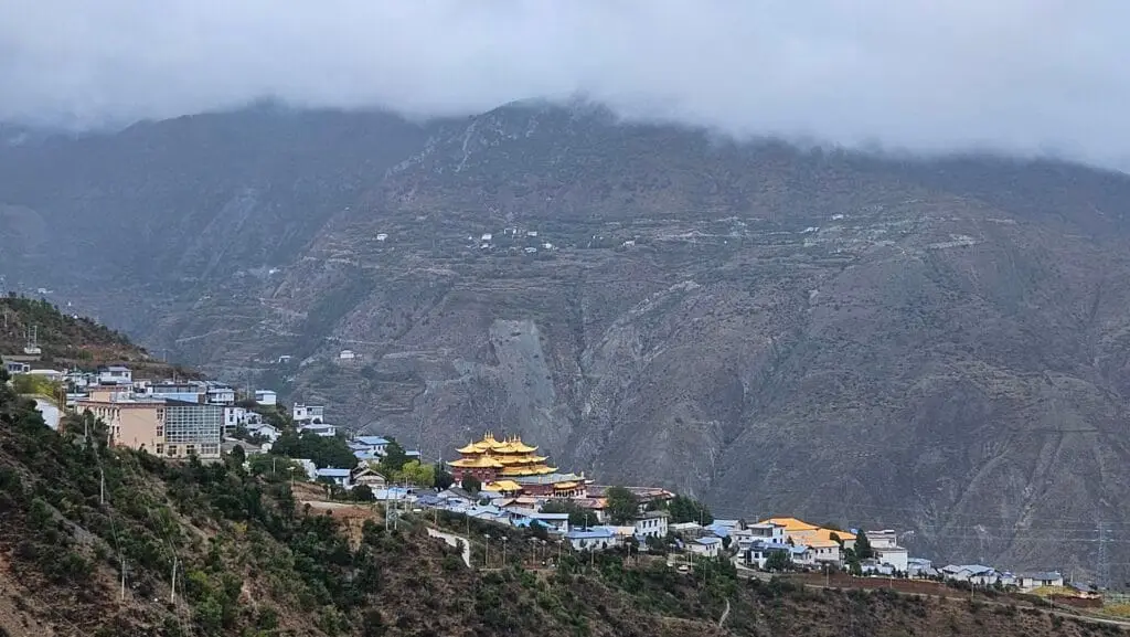 Le Monastère de Gadan Dongzhulin (噶丹东竹林寺) est situé sur une colline au sud du Benzilan, à environ 105 kilomètres de la ville de Zhongdian (aujourd’hui Shangri-La). Le monastère est facilement accessible en voiture grâce à la route de l’axe Yunnan-Tibet, qui passe directement derrière le temple. Il se trouve à une altitude de 3 000 mètres et bénéficie d’un climat montagnard de mousson, caractérisé par des hivers froids et des étés modérés sans chaleur extrême.