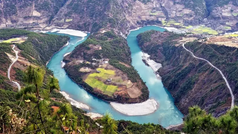 Un belvédère situé le long de la route permet d’observer les villages environnants et leurs paysages champêtres. Pour admirer une vue panoramique de ce méandre spectaculaire, il est recommandé de gravir les montagnes avoisinantes au lever du soleil. Dans la brume matinale, le premier méandre du Nujiang apparaît et disparaît à travers les nuages, créant une atmosphère féerique digne d’un paysage céleste.