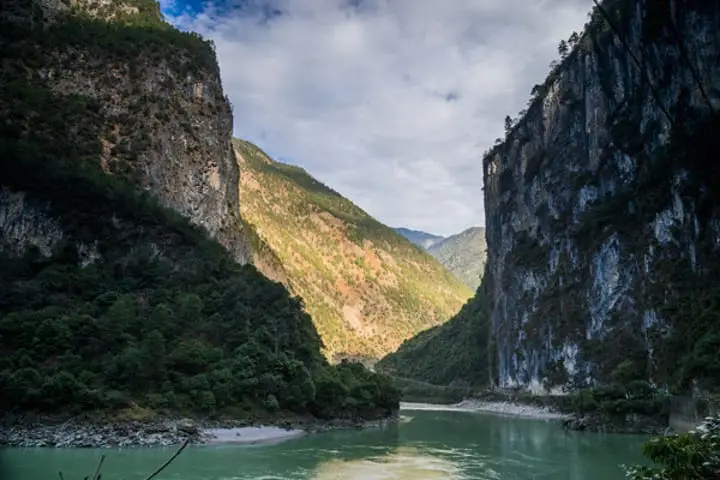 À l’extrémité nord du plateau de Bingzhongluo, les montagnes Gaoligong et Biluo encadrent la rivière. Ces deux falaises abruptes s’élèvent directement depuis les berges, atteignant les nuages, et forment une gigantesque porte de pierre d’environ 200 mètres de largeur. Le Nujiang jaillit avec force à travers cette ouverture, connue localement sous le nom de Nanli Qiang, ou plus communément appelée “Porte de Pierre” (Shimen Guan) en raison de sa forme évocatrice.