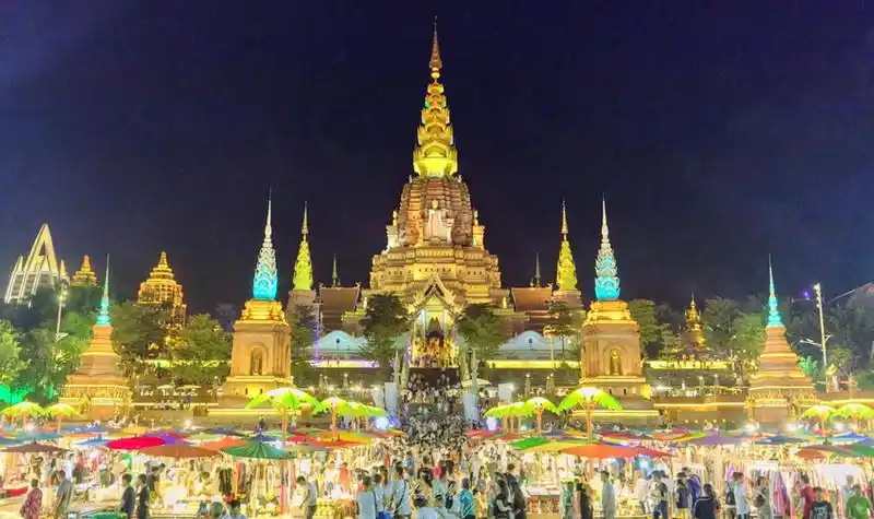 Sur la grande place devant le Temple de la Grande Pagode, se trouve le célèbre Marché Nocturne de Gaoghuang Xishuangjing. Les lumières éclatantes, les spécialités culinaires et les artisanats raffinés attirent un afflux constant de visiteurs.