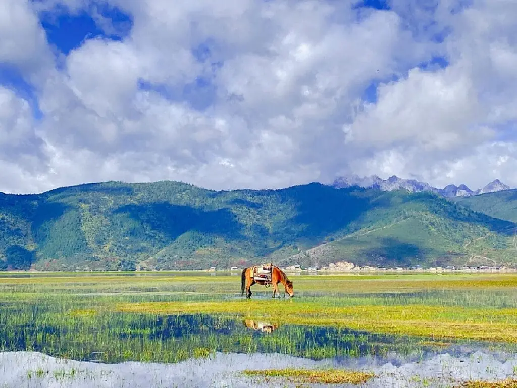 Le lac Napa est une vaste zone humide saisonnière située près de la ville de Shangri-La, dans la préfecture de Diqing, au Yunnan, en Chine. Il se trouve à une altitude d’environ 3 266 mètres et est entouré de montagnes pittoresques et de prairies. Ce lac prend la forme d’une plaine inondée en saison des pluies (de juin à septembre), mais se réduit en hiver, formant un pâturage vaste et humide. Le paysage du lac Napa change de manière spectaculaire au fil des saisons, offrant à chaque moment de l’année une atmosphère unique.