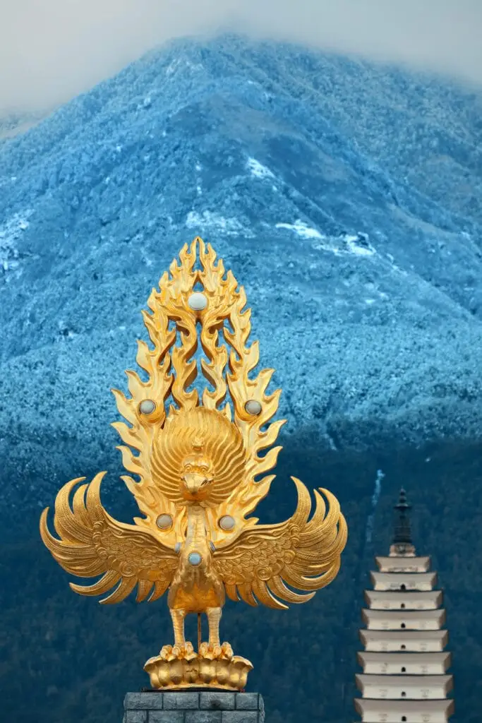 Dali Old Town with pagoda and phoenix statue before snow capped Cangshan in Yunnan, China.