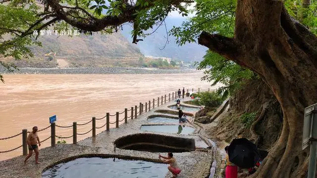 À environ 12 kilomètres au nord de la ville de Lushui, sur la rive ouest de la rivière Nujiang, se trouvent plusieurs sources chaudes en plein air, parfaitement situées face aux vagues du fleuve. C’est là que les Lisu organisent leur Fête des bains. Un panneau au bord de la route indique l’accès aux bains de Denggeng, avec deux chemins aménagés qui mènent aux sources chaudes situées respectivement au sud et au nord.