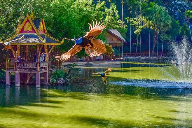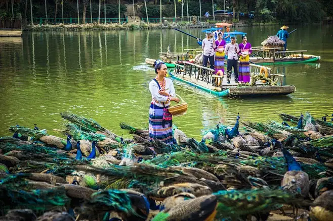 Au cœur du parc se trouve un hameau dédié aux paons, où des jeunes filles Dai exécutent des danses gracieuses au milieu d’un vol de paons. Chaque jour, sept lâchers de paons sont organisés, espacés d’environ une heure. Chaque spectacle dure environ 10 minutes, durant lesquelles des centaines de paons s’élancent dans le ciel, dessinant des arcs élégants au-dessus d’un lac scintillant avant d’atterrir doucement sur la rive. Le spectacle est grandiose et laisse une impression inoubliable. Les visiteurs peuvent également interagir avec les paons, jouer avec eux et prendre des photos, ajoutant une touche ludique à leur visite.