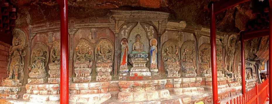 Le groupe de grottes de Shibao, considéré comme un trésor de l’art rupestre du Yunnan. Réparti sur les falaises escarpées du mont Shibao, comprenant 16 grottes abritant des centaines de statues de Bouddha, de bodhisattvas et de rois célestes.