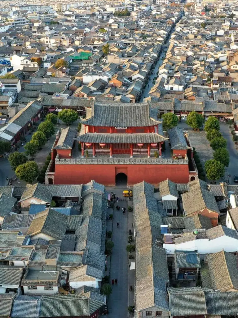 Vieille ville de Weishan: La vieille ville de Weishan est organisée selon un plan en damier, mais ses portes, ses murailles, et ses rues sont inclinées. Ce qui semble être des “portes et des rues de travers” cache en réalité une sagesse subtile. En hiver, Weishan, à cause de son altitude élevée, est assez froide. Les rues inclinées permettent de détourner le vent du nord, réduisant ainsi son impact sur la vie des habitants. Cela reflète une coexistence harmonieuse avec la nature.