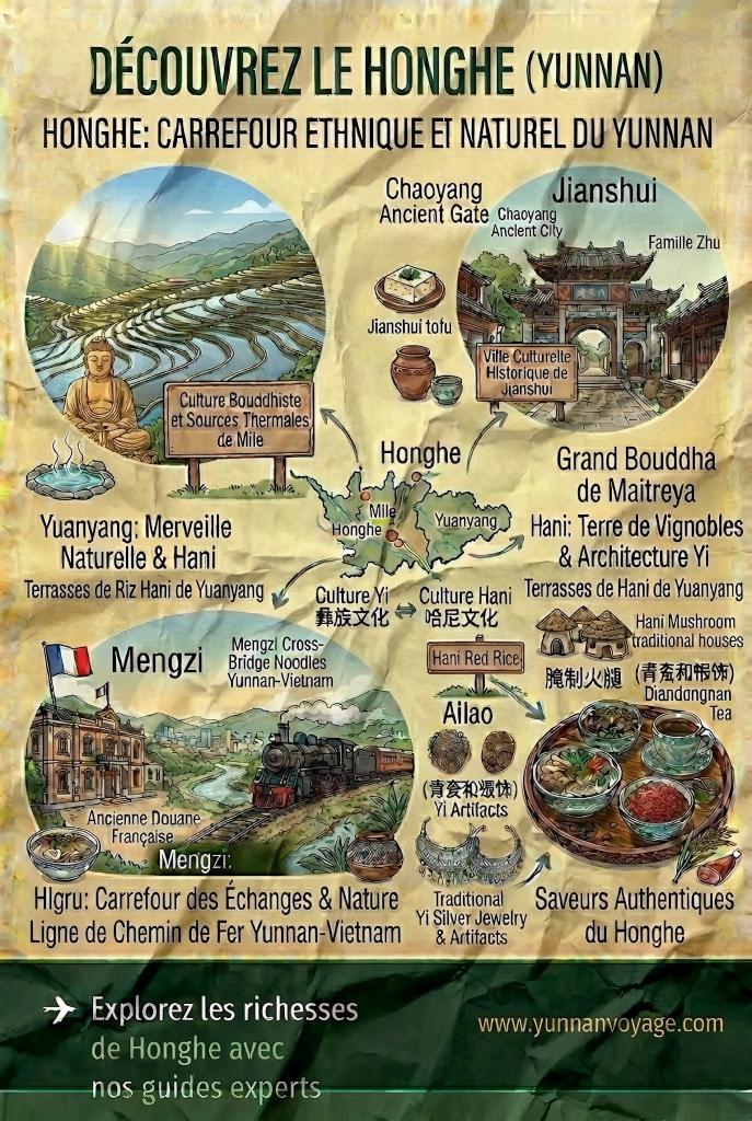 Située au sud de la province du Yunnan, la région autonome honghe Hani et Yi, souvent appelée simplement “Honghe”, est une destination charmante au sud du Yunnan. Cette région est célèbre particulièrement par ses paysages spectaculaires des rizières en terrasse, sa riche culture chinoise mélange avec les ethniques locales et ses traditions agricoles séculaires.