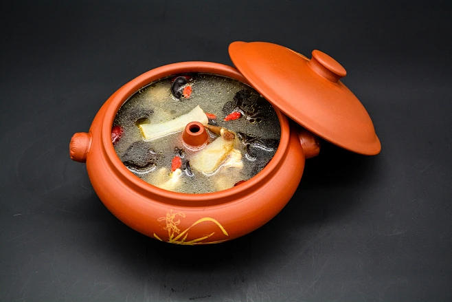 Un bouillon de poulet cuit à la vapeur dans une marmite spéciale en céramique, préservant ainsi toute la saveur naturelle du poulet.