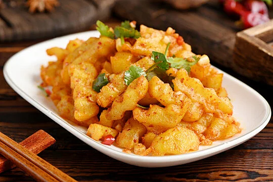 Un en-cas de rue populaire à Kunming, où les pommes de terre sont coupées en lanières ou en tranches, frites jusqu’à obtenir une couleur dorée, puis saupoudrées de poudre de piment et d’épices, offrant un extérieur croustillant et un intérieur tendre.