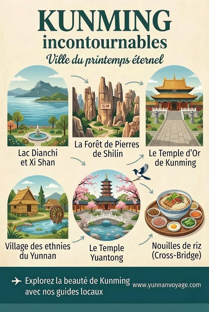En flânant dans les ruelles de la vieille ville, les visiteurs peuvent découvrir l’artisanat local et déguster une cuisine variée qui met en valeur les saveurs uniques du Yunnan. Que ce soit pour explorer ses merveilles naturelles ou pour s’immerger dans son patrimoine culturel, Kunming est une destination incontournable pour les voyageurs en quête d’authenticité et de beauté.