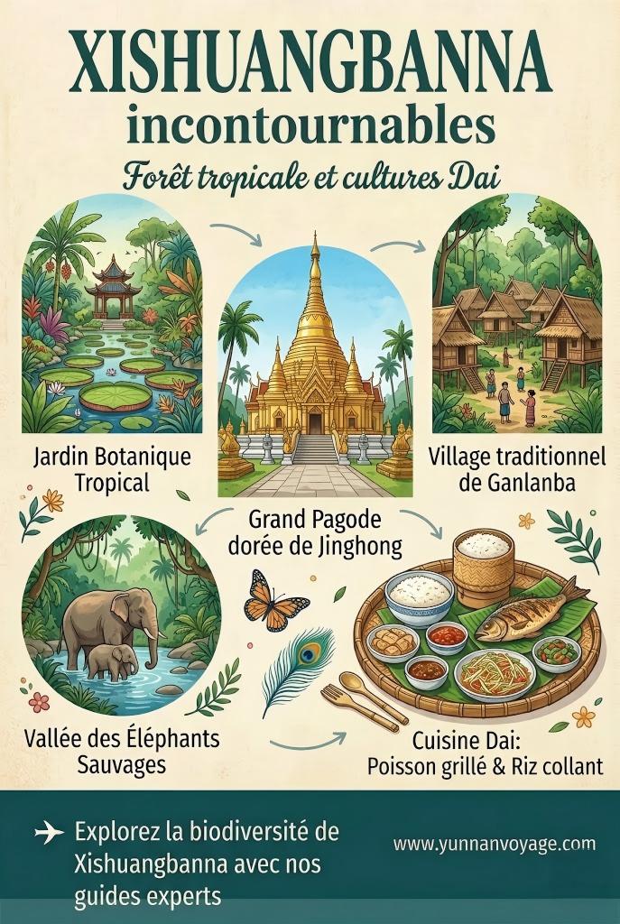 Pour profiter pleinement de votre voyage à Xishuangbanna, il est conseillé de visiter pendant la saison sèche, de novembre à avril, pour éviter les pluies abondantes de la mousson.