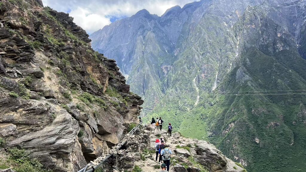 Grâce à sa popularité dans le milieu de la randonnée, on trouve tout au long du chemin des petites auberges perchées sur les falaises. Parfait pour faire une pause, manger un bout, ou simplement siroter un café en regardant les sommets enneigés se teinter de rouge au coucher du soleil. Pas besoin de porter un gros sac : en deux jours, on parcourt environ 25 km, avec une altitude maximale d’à peine 1 800 mètres. Le sentier serpente à travers une vallée sauvage : en bas, le fleuve Yangtsé gronde avec fracas, et tout autour, les montagnes du Yulong et du Haba vous accompagnent. C’est une marche où l’on transpire, mais chaque pas est récompensé par la beauté du paysage.